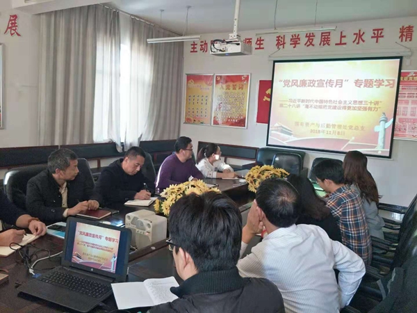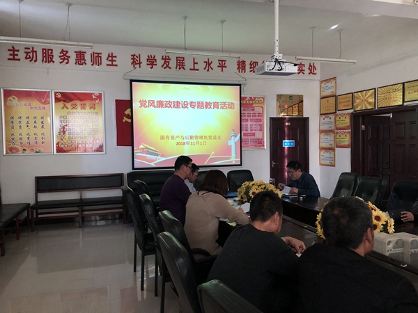 国有资产与后勤管理处党总支按照党风廉政建设宣传教育月活动时间安排,在“党风廉政建设宣传教育月”活动期间,每周四下午在后勤会议室组织全体党员开展专题学习教育活动,先后安排了学校《2018年党风廉政建设宣传教育月活动实施方案》、《中国共产党包头市第十二届纪律检查委员会第三次全体会议决议》和“习近平新时代中国特色社会主义思想三十讲”等学习内容,并举办了《关于基层干部违纪违法的规范对策》专题讲座。